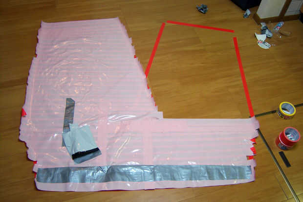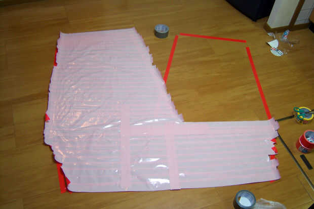 Hice este a partir de la capa interior. Empecé a poner las tiras horizontales de la cinta roja de la cintura para abajo, procedimiento hasta llegar al final de la primera etapa. (Obviamente esto se hace con el lado pegajoso hacia arriba.) Sólo hice una pierna a la vez, en parte porque quería practicar mi técnica antes de comenzar la segunda etapa, y en parte porque era más fácil llegar a partes de los pantalones con sólo una pierna en mi camino.
