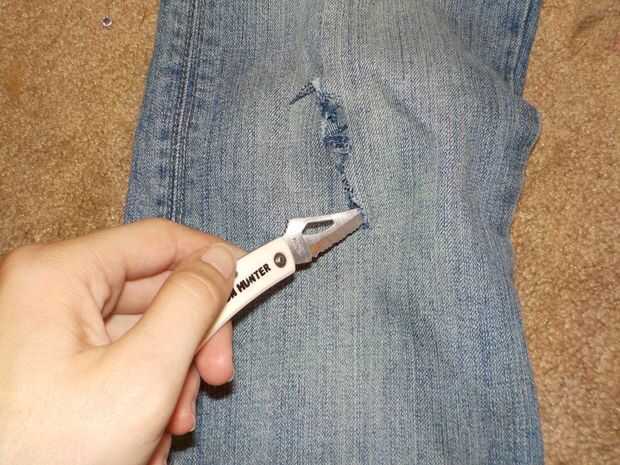 Después de quitar todo lo que brillo y brillo, llegué a trabajar triturar un par de agujeros werewolfish buscando en las áreas de rodillas de los pantalones. Usé el cuchillo de bolsillo a hacerlo así, porque tijeras habría cortado demasiado limpio y yo iba para algo más como marcas de garras desiguales.