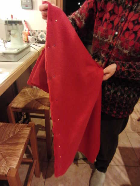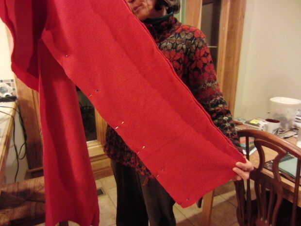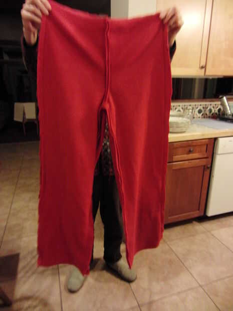 Coloque los dos pedazos que ahora tienes para eso si eran adjunto sería interior. Marque la línea con tiza otra vez. Coser la costura en el interior de sus piernas primero. Cuando usted cruza el área donde todas las cuatro piezas cumplir recorte de material excedente y obtener tan plano como posible por lo que no es un bulto grande allí. Luego coser la costura exterior. Con estos todos juntos puede Pruébese ahora y asegúrese de que encaja bien. Debe haber un poco exceso de cintura y piernas para el dobladillo y cintura.