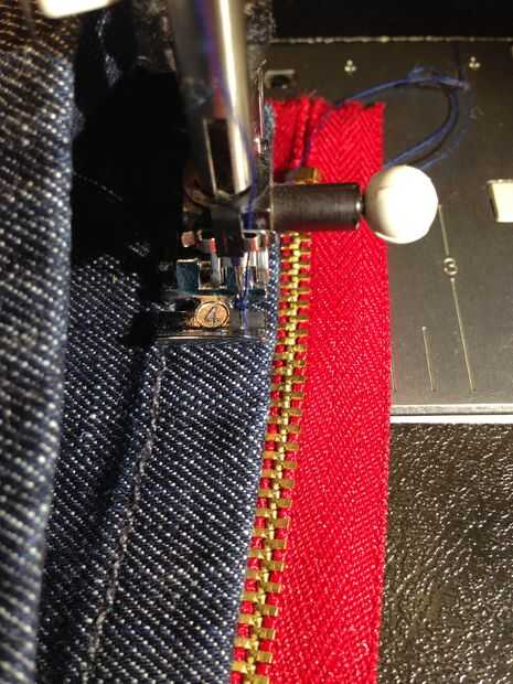 3. Al llegar cerca del final, puede que necesite mover el tirador de cremallera detrás del prensatelas para tener suficiente espacio para maniobrar. Cuando estés sobre una pulgada o tan lejos de la atracción, pare la máquina con la aguja hasta el ancla de la tela. Levante el prensatelas y abra la cremallera por lo que termina la tracción y pulgadas más o menos detrás del pie. Baje el prensatelas y cosa hasta el final. Virar el final de la costura al igual que al principio.