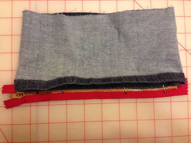 1. Con el brazalete de adentro hacia afuera y aplanado en la superficie de trabajo, coloque el borde terminado en la mitad inferior contra los dientes de la cremallera. El cierre debe ser cerrado y tire de la cremallera a la izquierda. Eje de la cremallera en su lugar. A qué distancia se pone borde de la banda hacia el centro de los dientes de la cremallera depende de si/cómo desea mostrar los dientes.