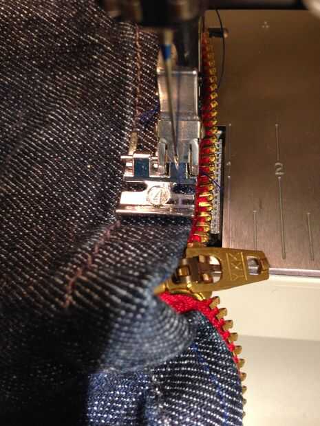 5. Dejar la cremallera abierta y coser la banda a la cinta de la cremallera, a partir de la parte superior de la cremallera. Esta parte de la costura de la cremallera es la más delicada maniobrar a través de la máquina. Va a ser sobre todo tan cerca del tirón de la cremallera. Tómate tu tiempo.