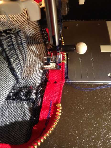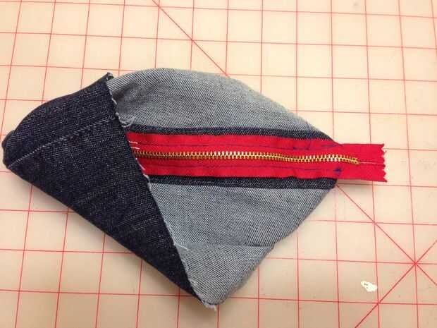 1. Estancia coser las piezas de la parte inferior de la cinta de la cremallera. Esto ayudará a evitar los extremos asomando por fuera de la caja de lápiz. Si usted necesita acortar la cremallera para adaptarse, puede hacerlo aquí. Puntada hacia atrás y hacia adelante varias veces a través de los dientes de la cremallera para crear una nueva parada de cremallera. Tenga cuidado de no intentar hundir la aguja en los dientes o es probable que se rompa la aguja. Recortar los extremos de la cinta de la cremallera, si se acorta la cremallera.