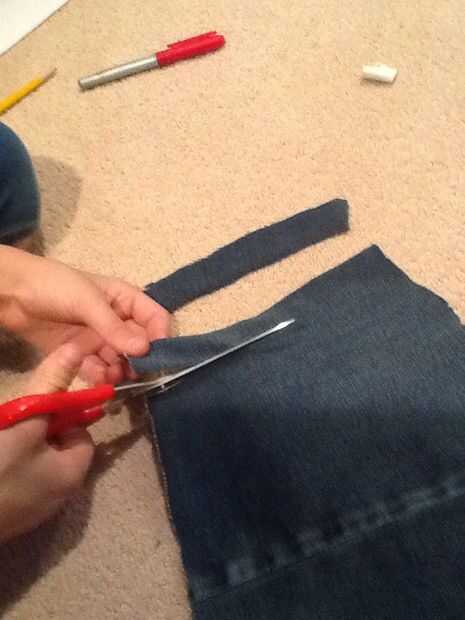 Toma tus tijeras y corta tus jeans en tiras de aproximadamente una pulgada de espesor. Asegúrese de que usted corta tres tiras.