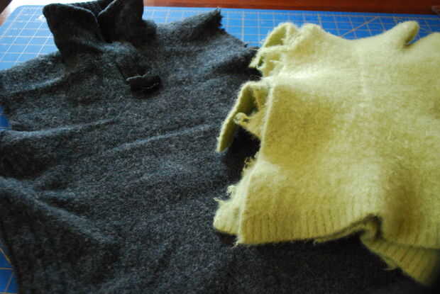 Suéteres de fieltro: Fieltro y reciclar viejos jerseys de lana por la máquina de lavado en agua caliente y secado en la secadora. Deben reducir y espesar para arriba - si todavía puede ver el patrón de hilo y repetir el proceso. I dos suéteres de lana 100% de fieltro y decidió usar el verde.