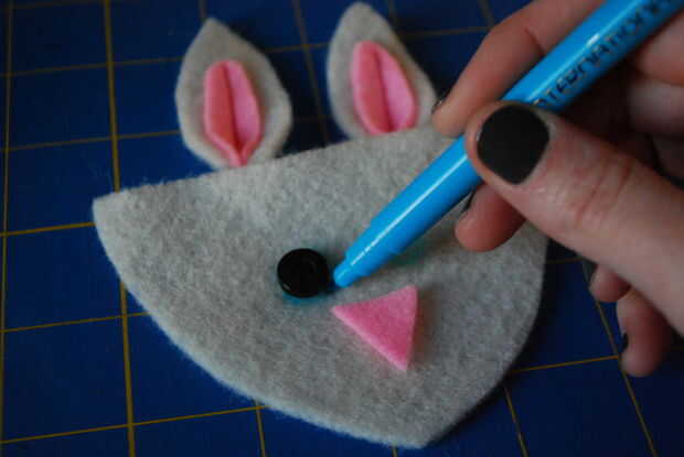 Corte una nariz rosa y coloque sobre la cara del conejito. Usando una pluma de tela soluble en agua, trace una línea alrededor de un pequeño botón (o dibujar un círculo a mano alzada) para los dos ojos. Rellenar los ojos con un hilo de bordado de la puntada y una puntada atrás. Repita el procedimiento para hacer la segunda cara de conejo.