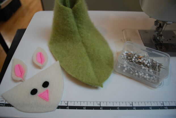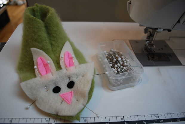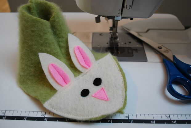 Tener una cara de conejo, dos orejas y un deslizador superior. Prender la cara de conejo en la parte superior del deslizador, deslizando las orejas entre las dos capas aproximadamente 1/4". Coser en la parte superior de la cara del conejo cerca del borde para asegurar el conejito de cara y los oídos a la zapatilla. Puntada alrededor del perímetro de la cara para garantizar todo - hará más fácil unir la suela más adelante. Gire el deslizador de adentro hacia fuera y dejar de lado. Repita para el otro zapato.