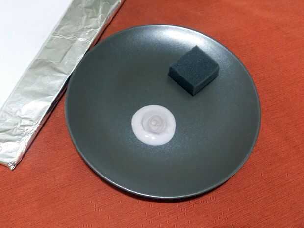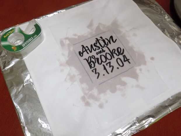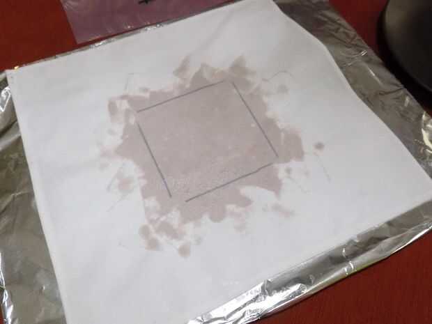 Vertemos algún tinte en un plato. Sumerja la esponja en el tinte y aplicarlo para el pañuelo. Asegúrese de que aplicar generosamente a la zona marcada en la hoja.