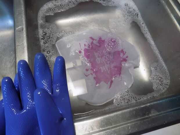 Enjuagar el tinte de la parte posterior de la película, pero lo mejor no deje demasiada agua que consiga en el lado pegajoso. El agua puede causar que se ejecute la tinta.
