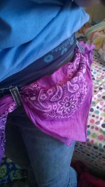 Encontrar las otras esquinas de la Bandana y tire de ellas hacia fuera y hacia delante. Esto debe crear un triángulo apuntando hacia abajo como se muestra.