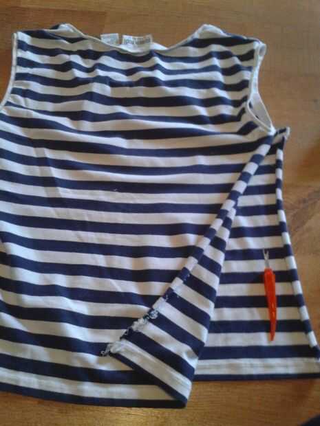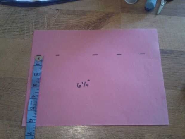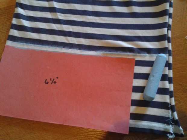 Medida y cortada, en el papel de construcción, 6 1/4" de alta para usar como una regla. Utilice a un abrecosturas abrir la camisa por un lado, por lo que se puede cortar. Corte horizontal a través y alrededor de la camisa para que usted termina con un trozo largo de tela cuando abrió. Repita el último paso para acabar con dos piezas largas.