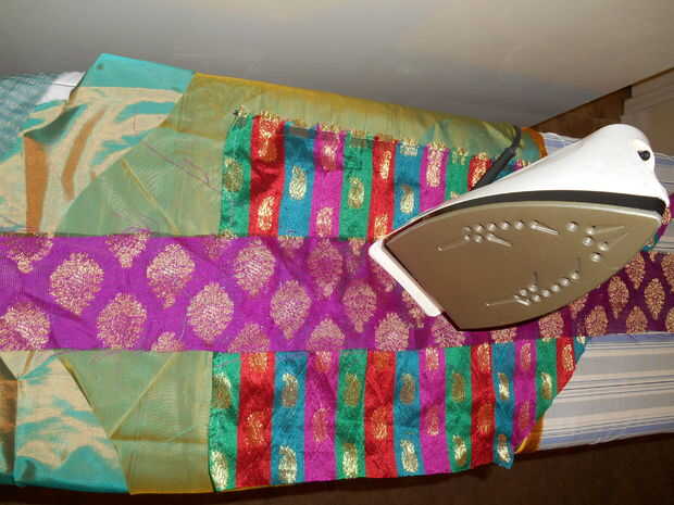 Presione suavemente su sari desechos (y cintas, si arrugado) con el hierro, así.