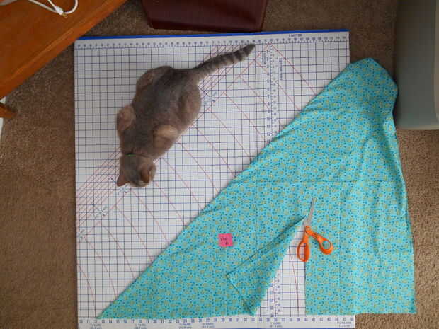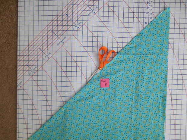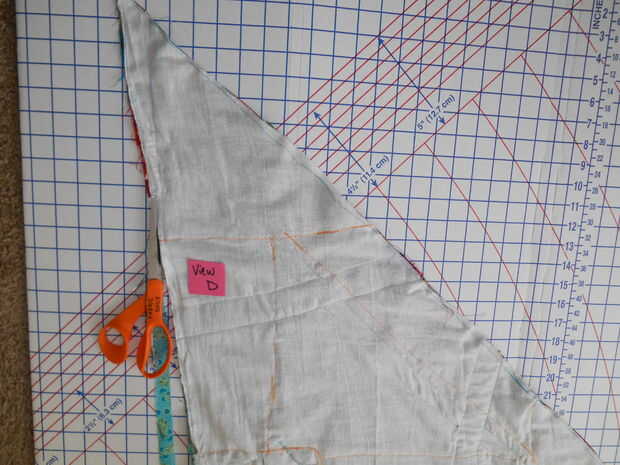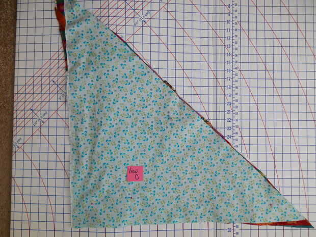 El perno del lado derecho del un triángulo calico en el lado derecho de su triángulo de patchwork, emparejar los bordes y las esquinas (ver C). Cuidadosamente usando una puntada recta y un margen de costura de 1/2", coser el calicó y el remiendo juntos a lo largo de los dos lados iguales. Recortar los bordes igual cerca de la costura sin cortar los hilos (ver D).