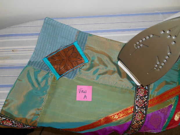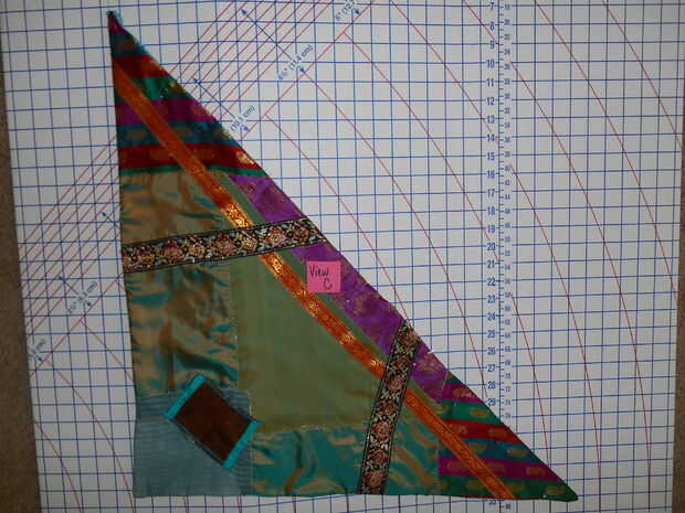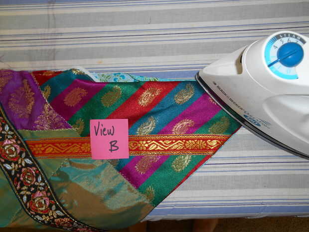 Toma tu pañuelo y gire a la derecho contra derecho; prensa, iniciando con el lado seda baja (vista A). Girar a los lados de la derecha del lado largo, inacabado hacia uno al otro, da vuelta en aproximadamente 1/2" y pulse (vista B), luego pin (vista C). Con una puntada recta, cose alrededor del triángulo entero como cerca del borde como sea posible, empezando por el borde largo (vista D). Clip cualquier hilos sueltos y listo!
