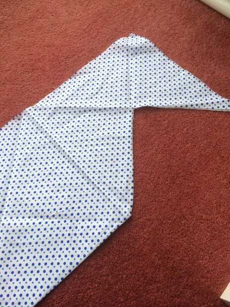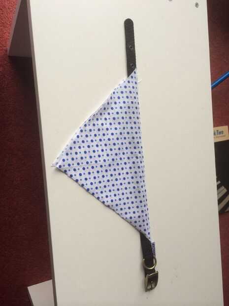 abre su material así que usted puede recortar un cuadrado (formado por dos triángulos planchados, es decir, los tejidos todavía doblados una vez), esta corte, a continuación, ajuste a la medida (para caber su collar), colóquelo sobre el collar para hacer esto, pero recuerde que necesita espacio para doblar los lados para evitar que se deshilache.