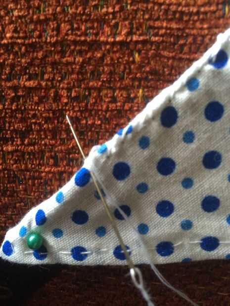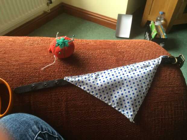 tome su cuello y el cuadrado de tela, coloque la tela sobre el cuello y coser alrededor del borde del triángulo, cuando se llega al borde con el cuello en coser a través el cuello demasiado (esto es donde los collares de cuero no muy buenos, aunque podría utilizar pegamento en lugar de coser la tela para el cuello, supongo, pero esto no es lo que hago)