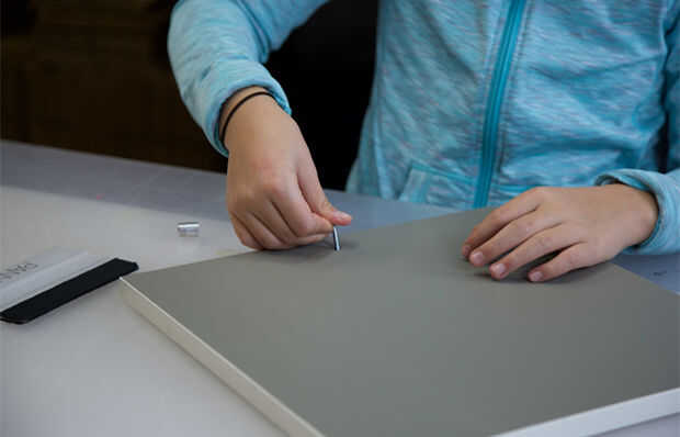 Localizar el orificio y pinchar suavemente el material con el tornillo. Fije la perilla.