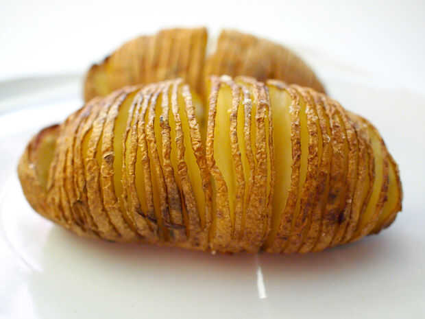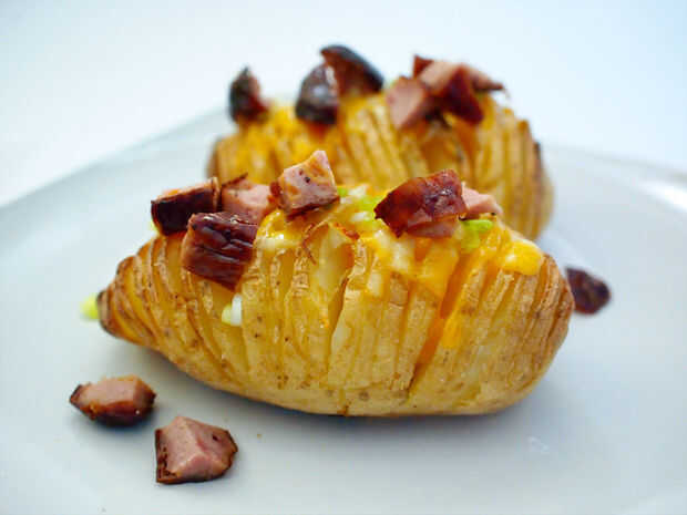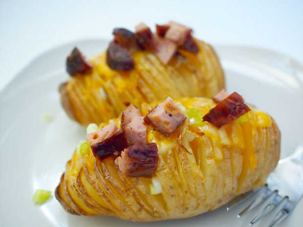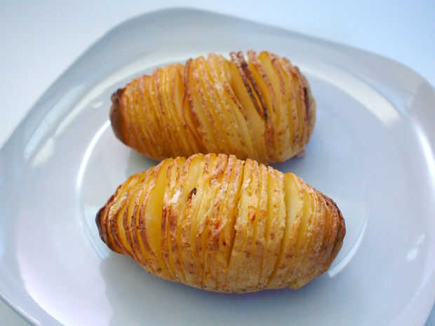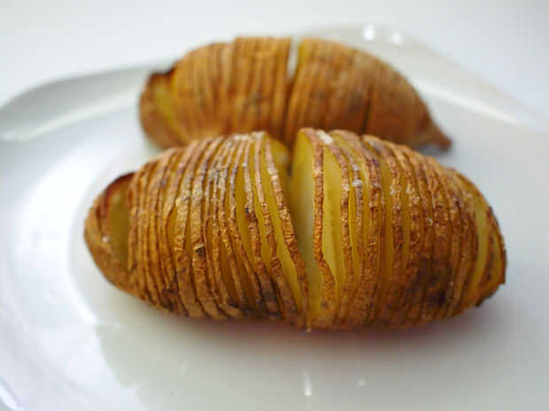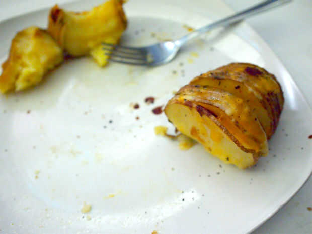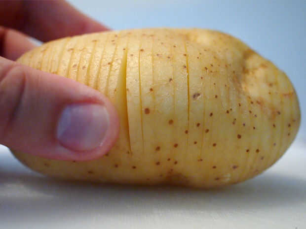 Con un cuchillo de cocina afilado, empieza a hacer una serie de cortes verticales a lo ancho de la patata, con permiso de cuidado no cortar cortar por completo a través del tubérculo - los cortes sólo debe ser de 3/4"(2cm) de profundidad.