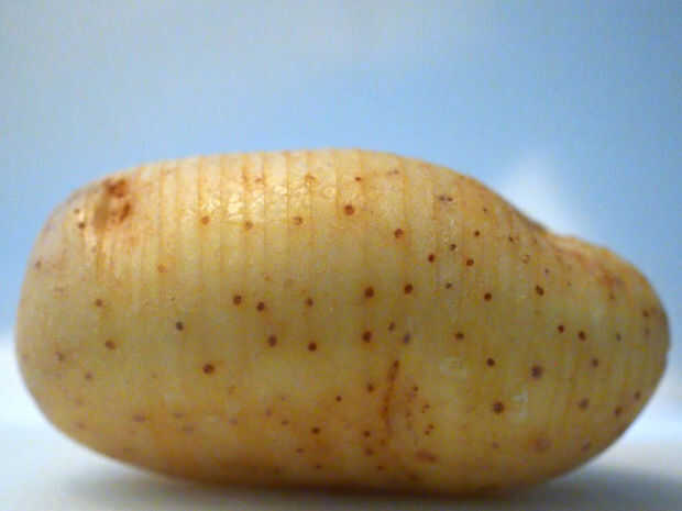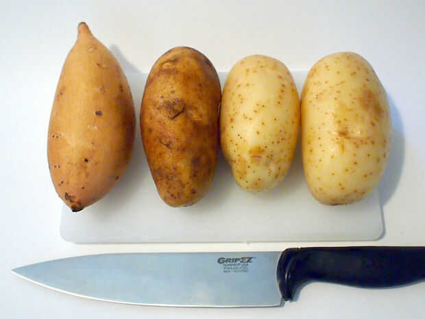 Este truco divertido se puede hacer con casi cualquier tubérculo. Papas de Ecologia las blancas y teja, y una batata.