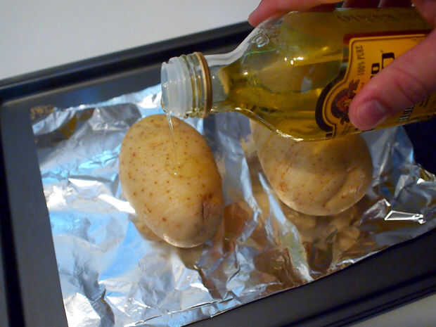 Coloca las papas en una bandeja de horno con el lado cortado hacia arriba, y luego rocíalas con aceite, sal y pimienta.