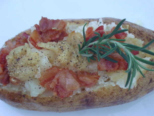 Saben tan bien como se ven! Russet papas rellenas de tocino desmenuzado, queso cheddar extra fuerte, cebollino fresco y especias! Si desea hacerlo, puede dejar de lado el tocino y hacer esto una receta vegetariana del lacto. Eso Papa pesaba apenas un