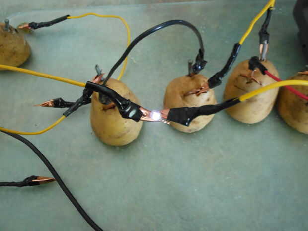 Esta vez la luz encendida para arriba!  Hurra!   Patatas pueden utilizarse como baterías.