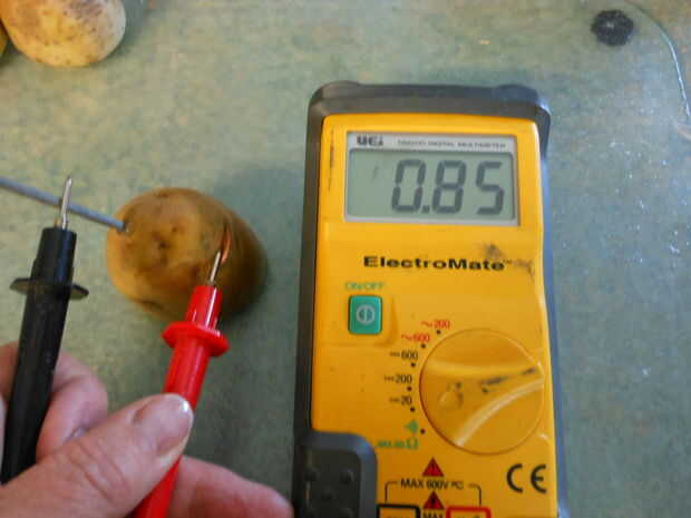 Utilice la línea roja para tocar el centavo en la patata y la línea negra para tocar el clavo. Usted puede leer cuánto voltaje tienes disponibles en esta batería de patata. Lee.85 voltios, no está malas pero no lo suficiente para hacer algo divertido.