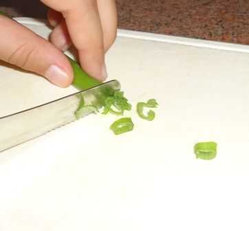 cortar las cebollas verdes en pedazos pequeños y el tomate en rodajas