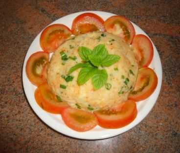 Añadir las cebollitas a la patata, poner todo en un plato nuevo y decorar con las rodajas de tomate.