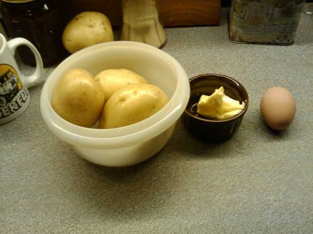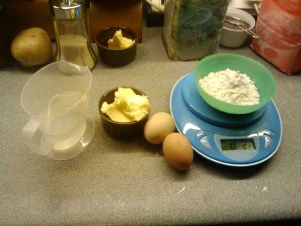 1 libra o 450 gms de puré de patatas 1/4 pinta 145mL de agua 3 huevos (1 yema de huevo y 2 huevos enteros) 2.5 oz (71g) de harina normal "todo uso". 3 oz (85g) de mantequilla (1 oz y 2oz)