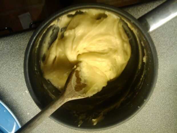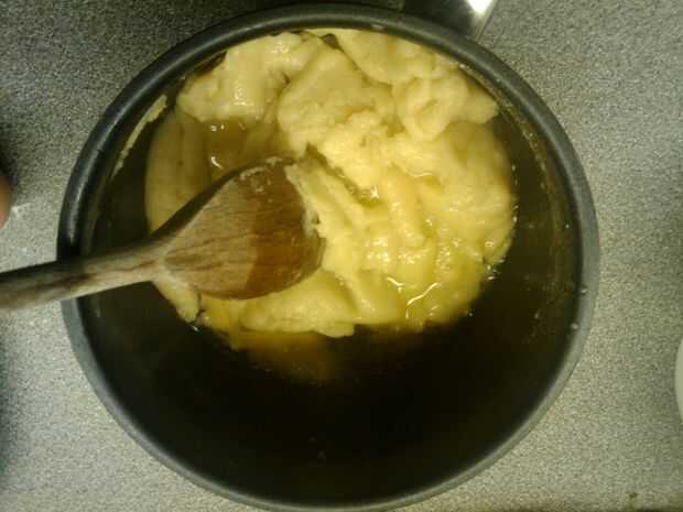 Romper el primer huevo entero y "picar" o cortar el huevo en la pasta de harina. Se verá horrible en esta etapa! Perseverar. Después de unos segundos la mezcla se convertirá en una pasta suave brillante. En este punto, añadir el otro huevo! Esta vez, tardará más tiempo para mezclarse en, pero una vez más, se borrará a la pasta.