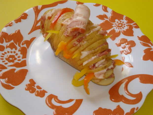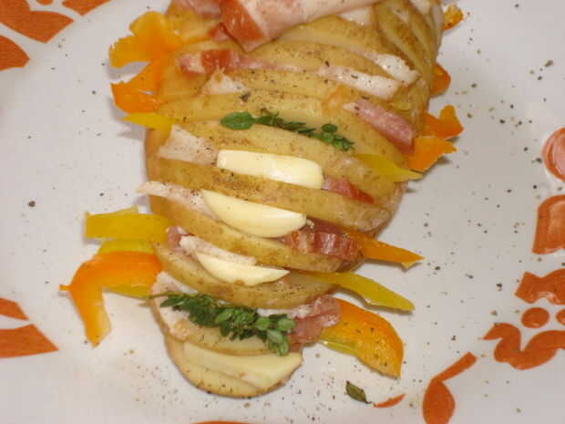 Inicio acodar las verduras, brotes de ajo y tocino entre la patata rodajas como se muestra. Cubrir con mantequilla si lo desea. Sazonar con sal y pimienta o lo que desee. Añadir hierbas. Coloque en una bandeja y hornee a 350 grados F por aproximadamente 1 hora. Cubrir con queso parmesano. Decorar con vegetales.