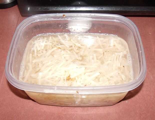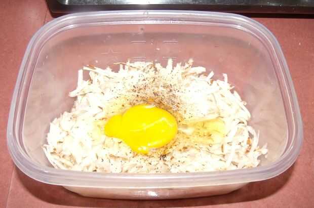 Lave tus papas bajo agua corriente y parrilla en un recipiente y cubrir con agua, agrega aproximadamente una cucharada cafetera de sal al agua y deja todo reposar sobre 10 minutos antes de drenar y agregar 1/4 de cocción aceite, 1 huevo sal y pimienta y mezcla bien. La próxima vez voy recortar la cantidad de aceite por aproximadamente la mitad