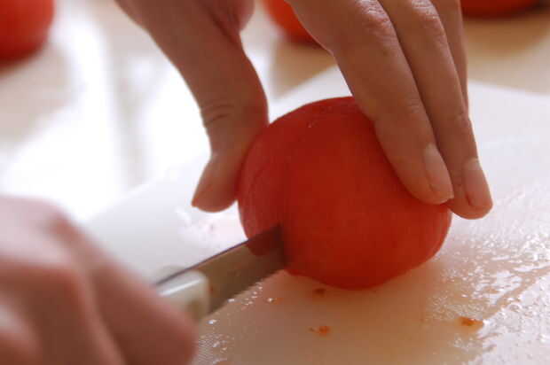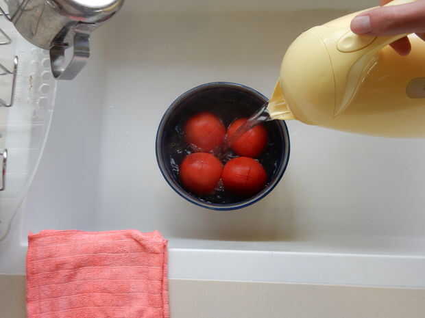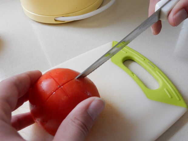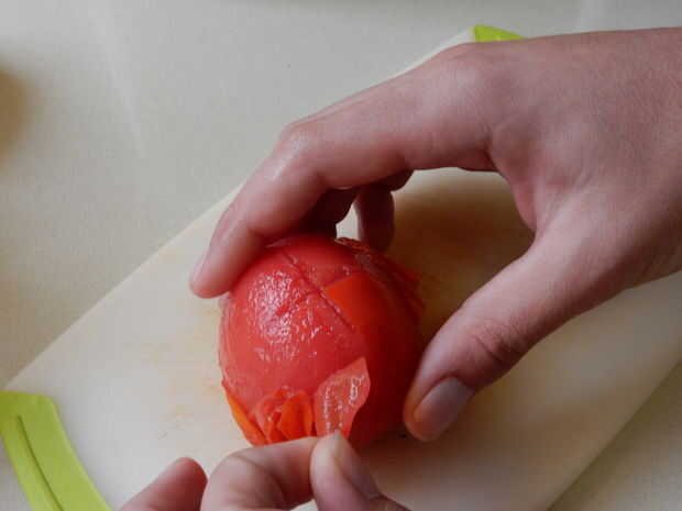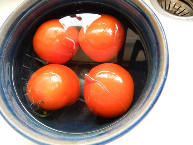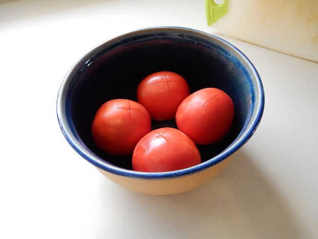 2. Como mucho tomate en el vaso, vierta en agua hirviendo, y esperar hasta que su piel comienza a salir (debe tomar aproximadamente un minuto).