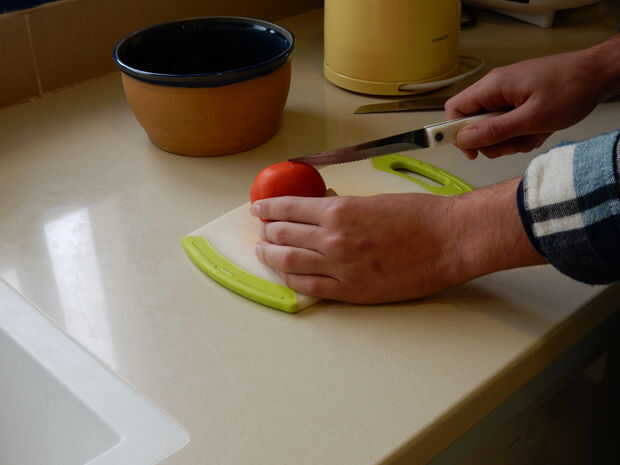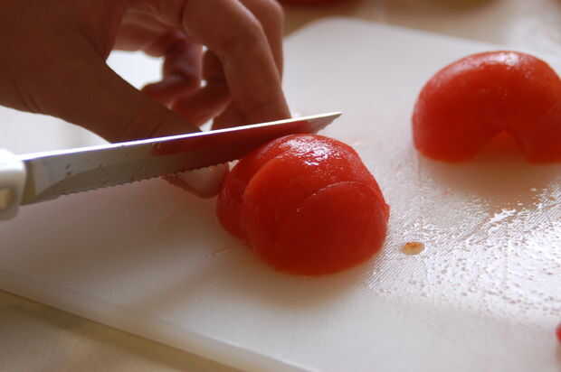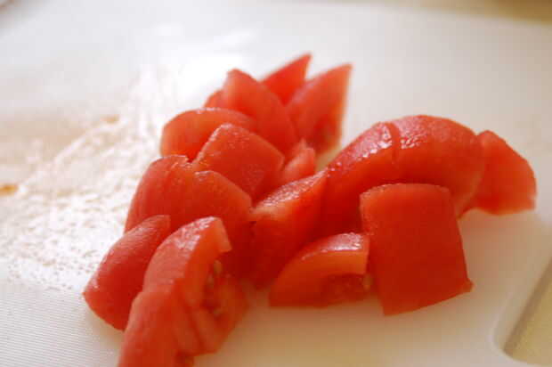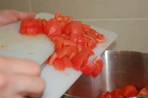 3. Cortar los tomates en cubos (aproximadamente dos veces el tamaño reduciría para ensalada) y poner en la olla.