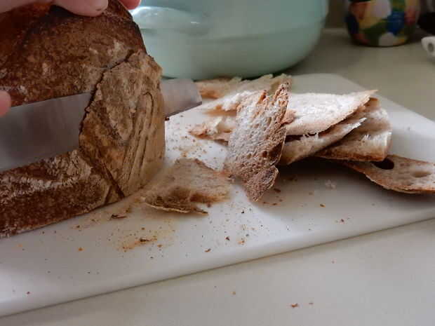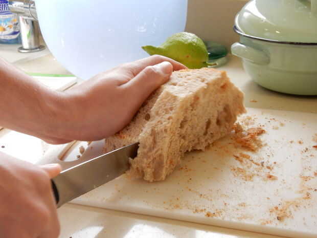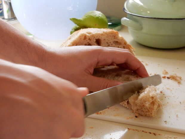 1. Utilizando el cuchillo, pelar la corteza del pan.