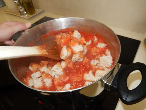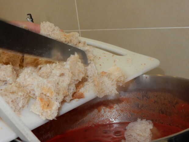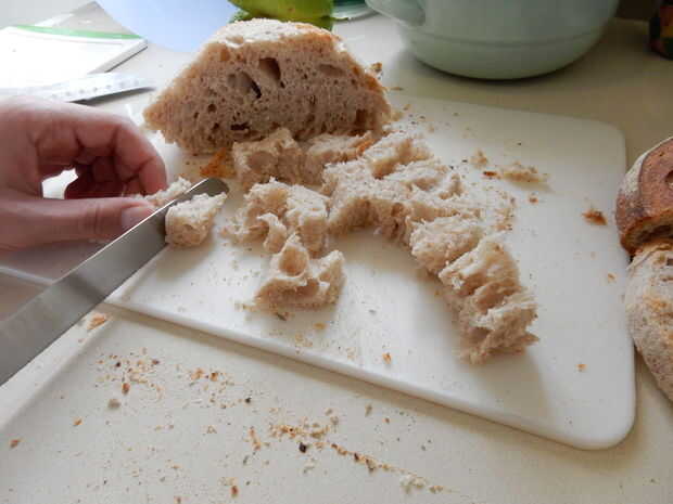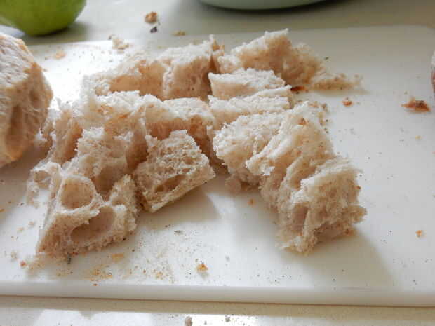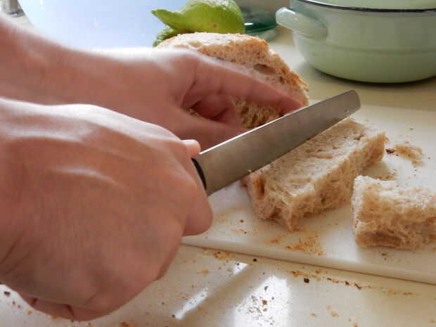 2. Cortar el pan en cubos pequeños - incluso un poco más pequeño que los tomates. Debe ser pequeña así que se convierten en migajas en la sopa y no quedarse en cubos.