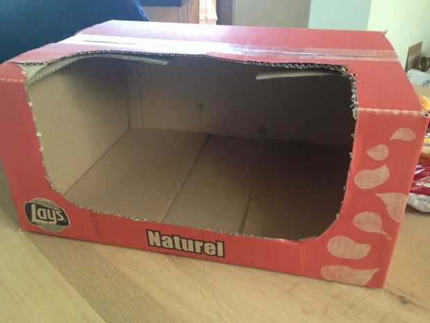 Comprar una caja de cartón de patatas fritas de su elección (como chips). Eliminar las virutas, dejando una caja vacía y la parte delantera quitado como en la imagen de abajo.