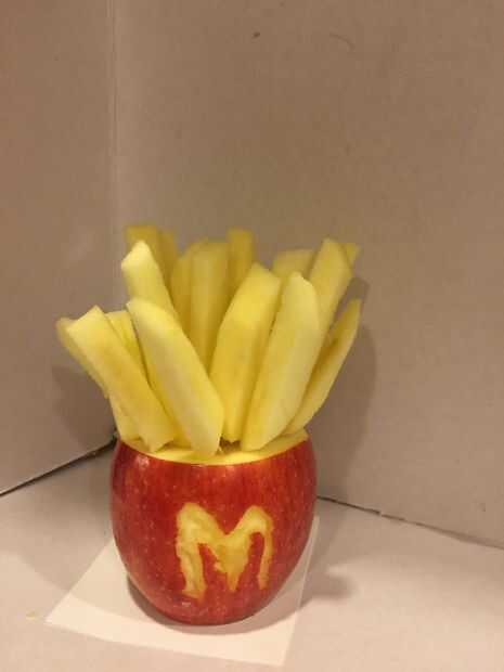 Materiales necesarios2 manzana preferiblemente tener buena apariencia1 cuchillo6 selecciones de dientese hará 1 scrapper o punta de cuchillo.pelador de 1 frutasObjetivo: - hacer estilo un McDonald papas a la francesa con soportePaso 1: iniciar Cortar
