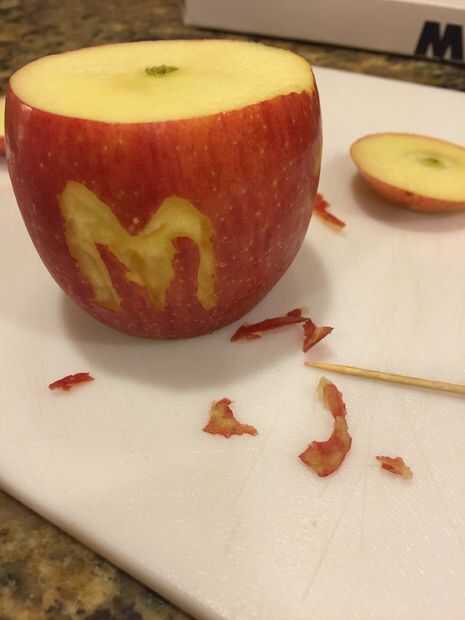 Cortar la parte inferior y superior de la manzana para comenzar la "caja" Para talla M de McDonald, utilice un palillo de dientes a tallar una M a continuación, Pele la piel