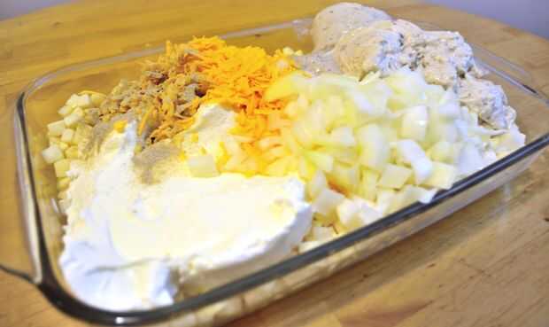En una cazuela de vidrio de 3 cuartos de galón, combine la bolsa de 1 kg de picada-hash brown patatas, 2 latas de condensada sopa crema de champiñones, 2 tazas de crema agria, 2 tazas de queso cheddar rallado, 1 cebolla amarilla picada, 1/2 cucharadita de sal de ajo y 1/2 cucharadita de pimienta blanca.
