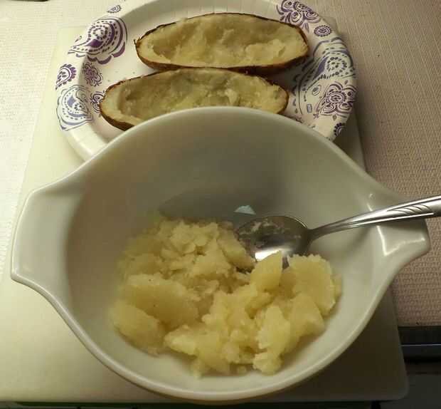 1. Cuando la patata al horno ha enfriado lo suficiente como para manejar, cuidadosamente dividida en dos lados.