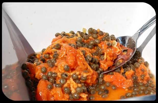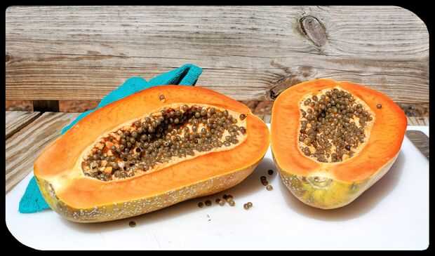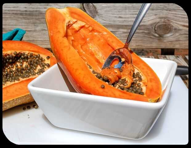 Levantarse la papaya y cortar por la mitad longitudinalmente, como se muestra en las fotos. Suavemente con una cuchara, retire las semillas de la fruta. La papaya es muy suave, así que suave con la cuchara. Asegúrese de guardar las semillas, ya que pueden ser utilizados en aderezos para ensaladas, como guarnición, o machacados y utilizados en lugar de pimienta.
