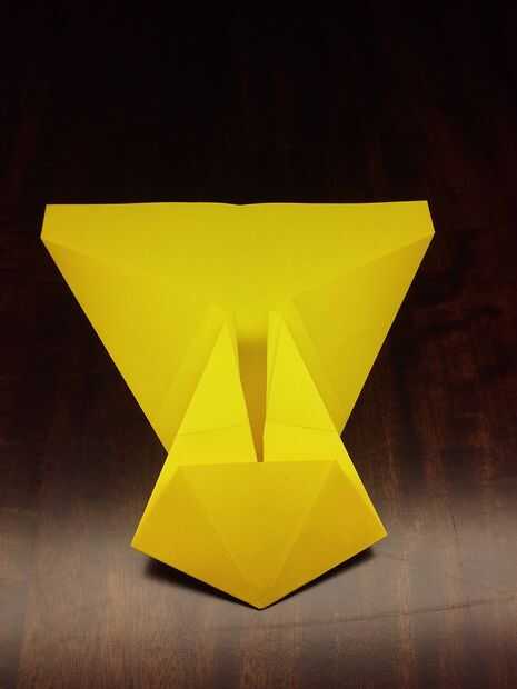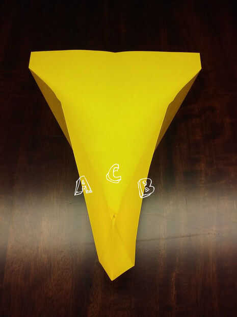 Pellizcar puntos A y B juntos hasta que se encuentran en el punto C. Ahora A y B deben apuntar hacia arriba. Doblar a la izquierda y derecha para crear un pliegue y luego volver nuevamente a su posición inicial. Empuje hacia abajo en el punto donde A y B se encuentran en la parte superior. Ellos deben ser capaces de empujar hacia abajo del plano. Cuando termine debería verse como la última foto