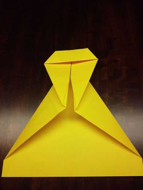 Voltea el avión entero. Doble la parte superior hacia abajo para que quede al ras con los bordes. Luego voltea el avión otra vez. Tomar las esquinas superiores y plegar como si estaban a partir un avión tradicional. Parar cuando la parte superior alcanza el centro. Repetir en ambos lados y luego voltear el avión una vez más