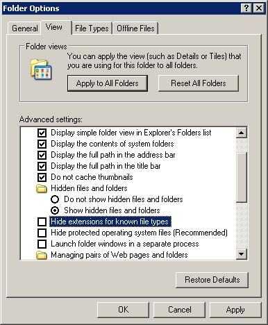 La única cosa a recordar es que mayoría de las versiones de Windoz automáticamente ocultar extensión de archivos así que cuidado de no cometer ese error. La extensión es el designador de tipo de archivo que dice la computadora que programa usar para abrir el archivo como M$ Word abre DOC, Bloc de notas abre el TXT, Photoshop abre JPG etc.. Para que las extensiones visibles necesita ir a mi PC y haga clic en herramientas luego opciones de carpeta ver. Retire la garrapata de ocultar extensiones para tipos de archivos conocidos. Una vez que el archivo por lotes puede simplemente seguir los mismos pasos anteriores y vuelve a marcar la casilla para volver a ocultar las extensiones.