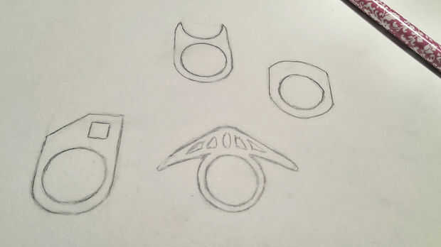 Comience trazando un círculo de la circunferencia de su dedo, puede usar un anillo que le cabe como una referencia no tiene que ser exacta ya que vas arena después. Entonces alrededor de él, traza la forma que desea. Haciendo un montón de detalles es más bonito pero también es mucho trabajo para que puedas empezar haciendo una simple sólo redondos o cuadrados con no muchos detalles. mi primero fue sólo anillo en forma de sin nada en la parte superior así que use su imaginación hasta que piensas en algo que gustaría.