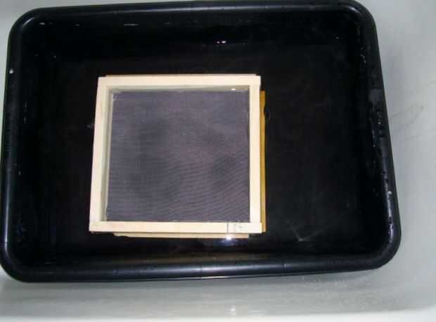 Levante el marco deckle uniformemente y permita que el agua drene.