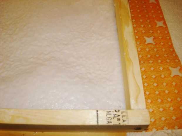 Vierta la pasta en el bastidor; hasta que la pulpa recubre los bordes del bastidor como se muestra.