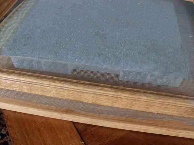 Básicamente, colocar un trozo de la malla de nylon en la parte superior de la hoja recién reciclada, que está todavía en el barbas, voltee la configuración completa para el barbas están ahora ontop y el trozo de malla de nylon en parte inferior. Tenga cuidado de mantener el trozo de malla de nylon apretada cuando la hoja o los bancos se deshagan.
